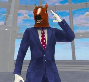 スーツに身を包んだ体格の良い馬面の姿が特徴。